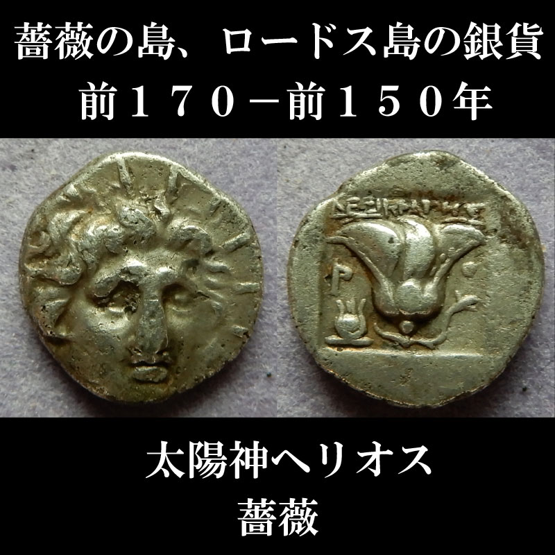 古代ギリシャコイン(額装付き) カリア地方 ロードス島 半ドラクマ銀貨 前170-前150年 太陽神ヘリオス 薔薇