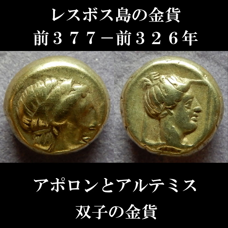 古代ギリシャ神話の双子アポロンとアルテミスがオモテ・ウラに表されたレスボス島の金貨