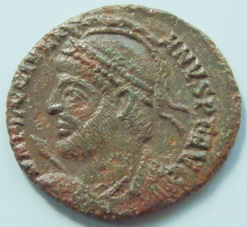 コインについて:髭などの肖像の細部も綺麗にのこっている、美しいコインです。このタイプの貨幣はローマ帝国の各地で造られましたが、このコインはパンノニアのシルミウムで発行されたものです。シルミウムの発行所は362年の改革の後、2つの発行所が残されましたが、364年、ウァレンティニアヌス1世の時に、約15年の発行所の歴史は幕を閉じました。