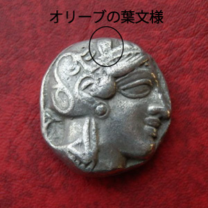 フクロウの頭上にはオリーブの葉と実。オリーブはアテナ神の象徴であり、オリーブオイルはアテネの名産品であった。