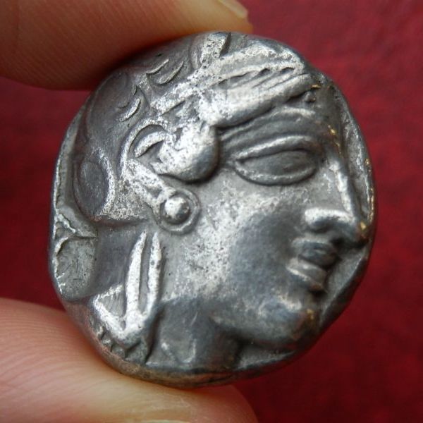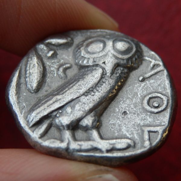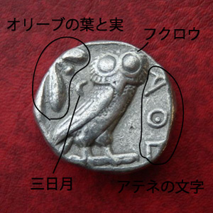 およそ前520年頃に、アテネは初めてオモテ面がアテナ神、ウラ面がフクロウ(アテナ神の聖島)のテトラドラクマ銀貨を発行した。ウラ面にはアテネを意味するAΘEの文字。フクロウの頭上にオリーブの小枝。