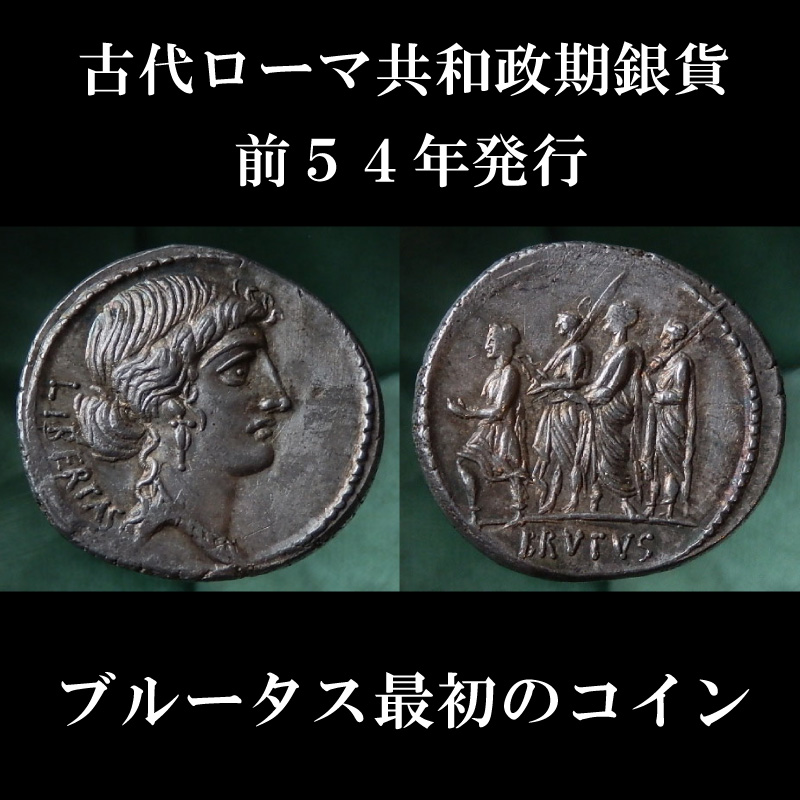 その後、前54年頃、ブルータスは貨幣発行三人委員として、始めてコインを発行した。その時のコインがこのデナリウス銀貨である。